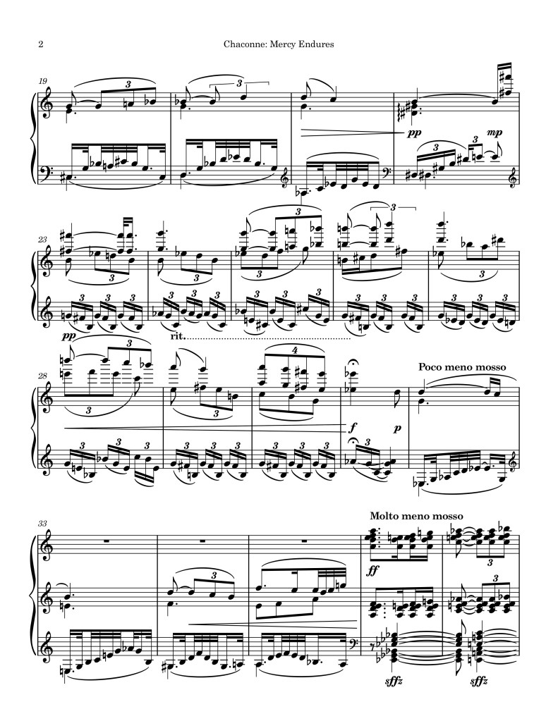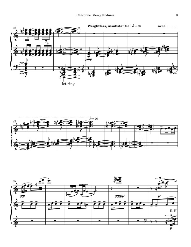 Chaconne: Mercy Endures is based on the chorale tune Danket dem Herren, denn er ist freundlich. The constantly repeated refrain in that text is “Mercy Endures”. The tune functions as both a recurring melodic fragment and as the basis for the chaconne formula.
